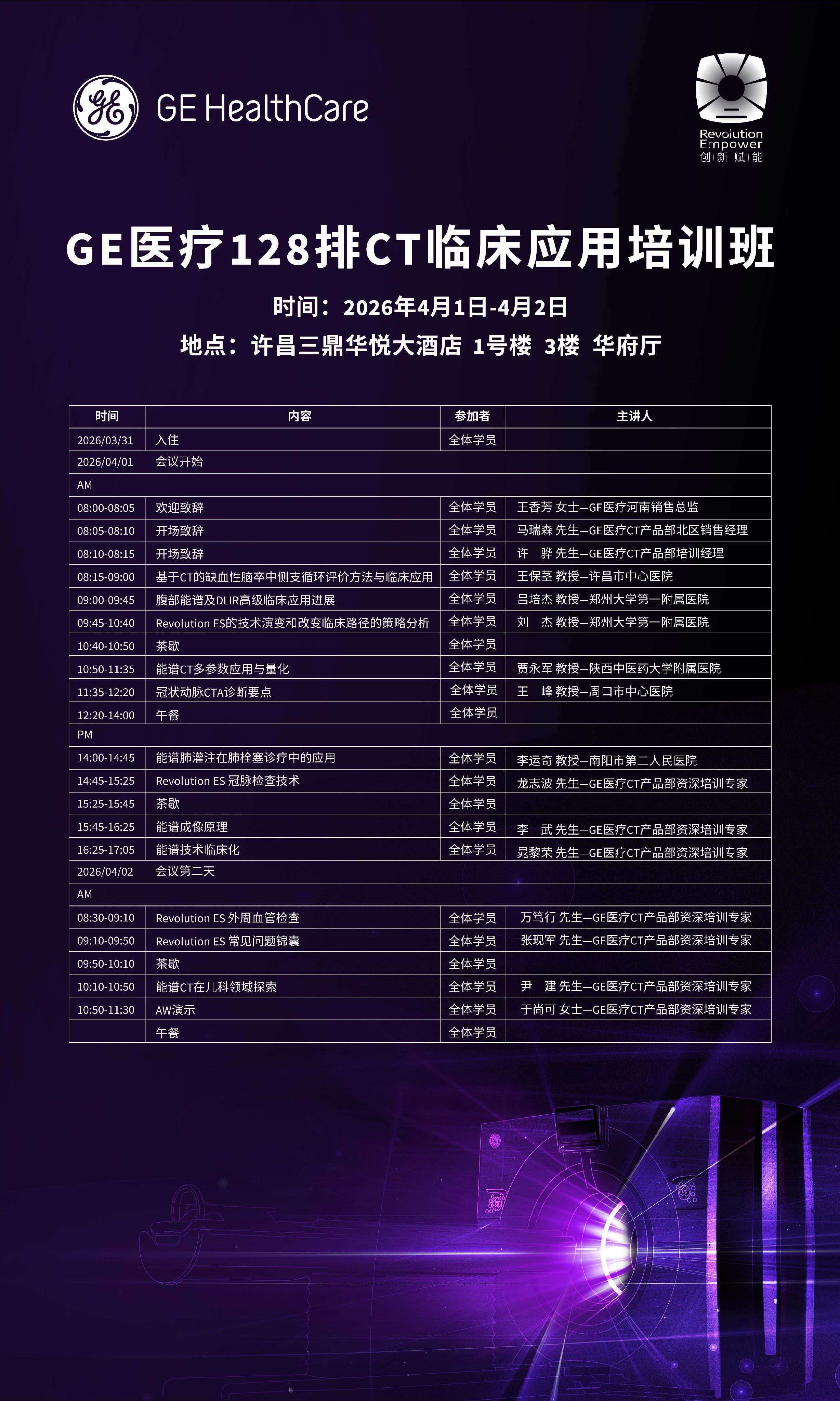 主题:培训班直播-GE医疗128排CT临床应用培训班 单位:GE医疗CT培训部 日期:2026.4.1 8:30-17:00,4.2 8:30-12:00