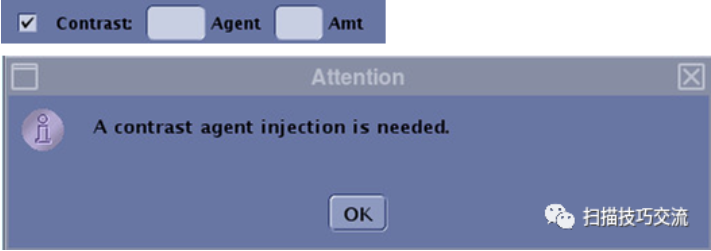 Contrast:增强 增强序列勾选此项,系统便会提示需要注射对比剂并停止扫描,扫描序列会带有+C标识。勾选Contrast后,出现Agent和Amt选项,分别填写药物名称及用量,且必须填写用量。特别注意:3D ASL序列不可勾选此项,会导致后处理不兼容问题。