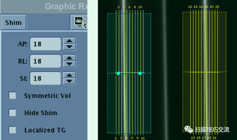 单击shim,在所需添加匀场的图像上点击即可添加,拖动匀场框边缘或中间实线可挪动位置,点击并拖动圆点可转动匀场角度。 根据需要调整局部匀场的大小,在三个方向可使用上下箭头或直接输入数字调整,若想添加正方形匀场,可勾选Symmetric Vol,则三个方向均统一为当前设置的最长长度。 若想要放置两个局部匀场框,在第一个匀场放置好之后,再次点击shim图标,按住shift键,单击鼠标左键,将匀场放置到相应位置。 在匀场放置好之后可点击Hide Shim将匀场框隐藏,以便调整定位线。 Localized TG是基于来自聚焦ROI 来改进预扫描的TG,用于提高特定区域TG的精确性,只适用于一个匀场框,常用于心脏扫描。