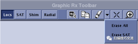 6、删除程序 选择需要删除的定位线、饱和带、局部匀场等,单击该图标即可删除该项。下拉三角还有Erase All和Erase SAT选项,当选择Erase All时一键删除所有,包括视野外的饱和带,从而造成图像的伪影(比如:TOF MRA,序列设置了视野外S方向的饱和带,以避免静脉的显影,当Erase All后,S饱和带被删除,动静脉都会显影),因此不推荐使用Erase All,当选择Erase SAT是,将删除所有饱和带,同样也包括视野外的饱和带,一样不推荐使用。