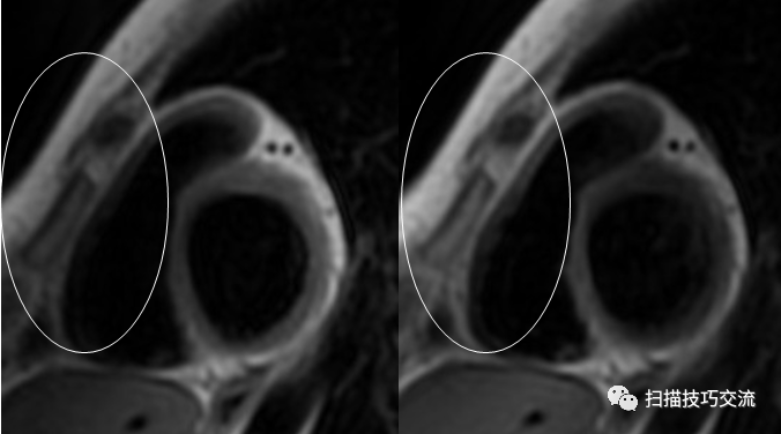 左图,双翻转黑血,匀场未勾选Localized TG;右图,双翻转黑血,匀场勾选Localized TG。勾选之后改善了白圈处的阴影。