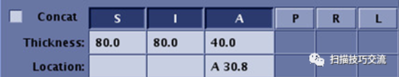 1、SAT:饱和带  包括6个方向的饱和带,Thickness为饱和带宽度默认是40mm,可通过饱和带上小方块拖拉宽度大小或者直接在此处输入数值。Location为饱和带位置信息,只有视野内的饱和带才有位置信息,拖动饱和带边缘实线可移动位置,拖动圆点可打角度。视野外饱和带常用在TOF MRA避免静脉显影以完成动脉成像,另外可减少血管搏动伪影。视野内饱和带相当于挡板的作用,常用在脊柱矢状面成像,减少吞咽、呼吸、肠道蠕动等运动伪影,添加饱和带处图像根据CV选择的抑制程度。