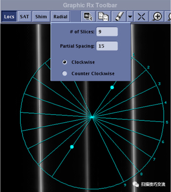 3、Radial:辐射状定位 在# of Slice文本框中,输入扫描层数,最大允许层面数36;在Partial Spacing文本框中,输入相邻层面间的角度数值;选择Clockwise(顺时针)或Counter Clockwise(逆时针)改变图像采集方向,系统默认顺时针。常用在2D MRCP或关节的扫描。