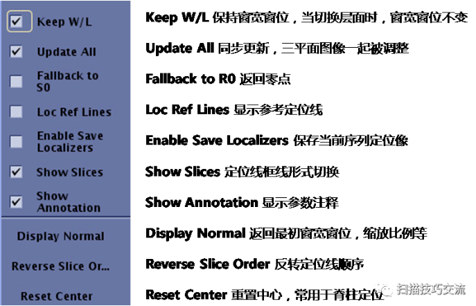 使用该图标可将处方窗口中的默认图像更改至所选图像,从列表中选择需要的序列,单击OK会将所选序列放入当前图像窗口,单击OK ALL会将所选序列列入所有图像窗口,常用于选取三平面。