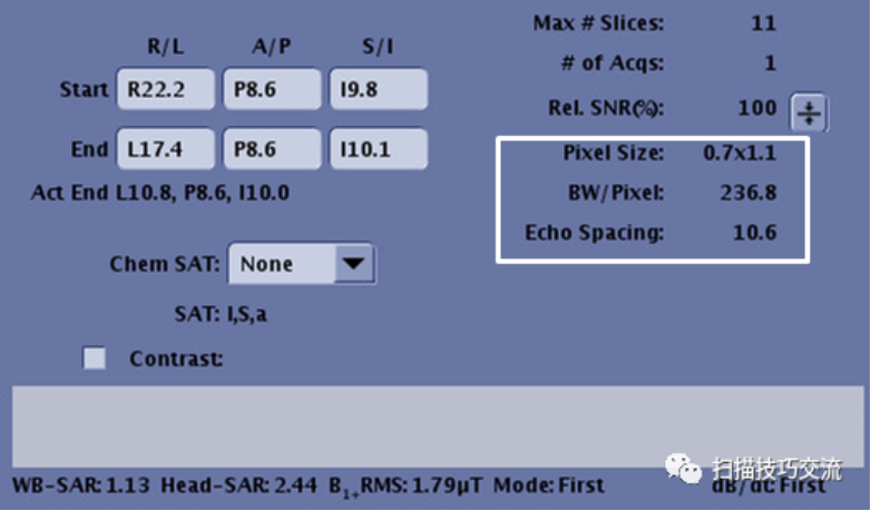 Pixel Size、BW/Pixel、Echo Spacing三个参数由于版本差异,有些设备没有,没有的也可以通过公式计算或界面其他参数得到。