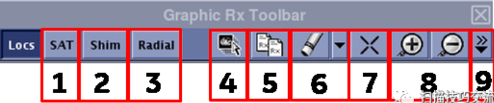 Echo Spacing:回波间隔  一般情况下回波间隔等于Minimum TE,当Advance选项卡CV中的Blurring Cancellation Option打开时,回波间隔约等于Minimum TE的2/3。下方空白方框处,一些界面的提示信息会在此处显示,比如当序列不让保存扫描时,一般会在此处弹出提示。最后一行为SAR特殊吸收率和db/dt梯度模式的显示。 下面介绍Graphic Rx Toolbar的使用,GRx工具条是定位过程中相对使用比较多
