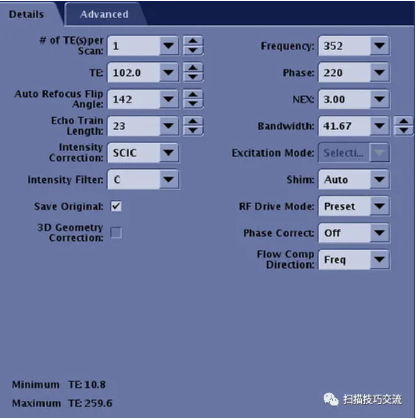 TE(Time to Echo)回波时间指射频脉冲激发到采集回波的时间。TE影响图像的对比和信噪比。TE选项通常有Minimum和Min Full,选择Minimum,即为部分回波技术,在频率方面不全采样,Min Full为最小全采样。在T2成像需要长TE,随着TE延长,增加了T2效应,信噪比也会降低。