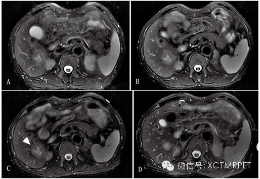 图 1 结肠癌肝转移患者,男性,64 岁(与图2 为同一患者)。A-D:分别为化疗前、化疗开始第3、7 及42 天连续T2WI 图像;显示肝右叶转移灶动态变化& #40; 白箭& #41;