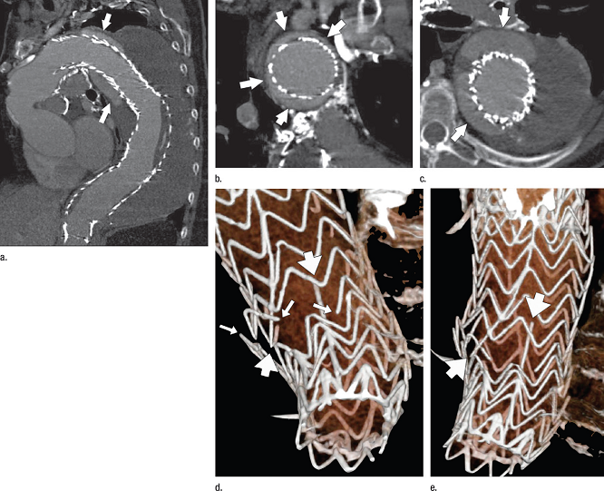 图9:胸主动脉降部行腔内支架术后1年,CT血管造影。(a)曲面重建显示,支架近端在主动脉弓远端曲度较小的部位脱落,并导致造影剂流向支架的周围,向下行,然后螺旋形向远处扩散(箭头)。(b)冠状斜位重建,主动脉弓远端的支架位置固定欠佳,主动脉周围大部分区域充满内漏的血流。(箭头所示)(c)225px长度的降主动脉瘤的横轴位图像(放置腔内支架时,其长度测量值为175px),箭头所示为动脉瘤腔的内漏。(d,e)VR图像显示支架远端多个横向支架环(窄箭头所示)和纵向支柱(粗箭头所示)的断裂。清晰显示支架断裂的末端及环的高度分离,表明远端部位支架移位严重,并失去了整体性。可能会导致近端支架的移位、IA型内漏的发生和主动脉瘤的扩大。(转载,见注解24)
