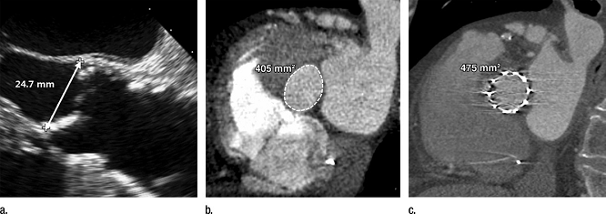图10 (a,b)TAVR术前采集的图像(a)经胸壁超声心动图(b)84岁,男性,严重主动脉狭窄症状,多排螺旋CT检查。二维超声心动图测量主动脉环直径24.7mm,选择26mm直径的经导管心脏瓣膜(面积132.75px2),尽管主动脉环在CT图像上的面积测量值是100px2,通常根据这个测量值,会推荐使用23mm的经导管心脏瓣膜。(c)术后CT图像上显示环形但没有完全展开的经导管心脏瓣膜,原因是在单一的二维图像上测量椭圆形结构,明显高估瓣膜的尺寸。