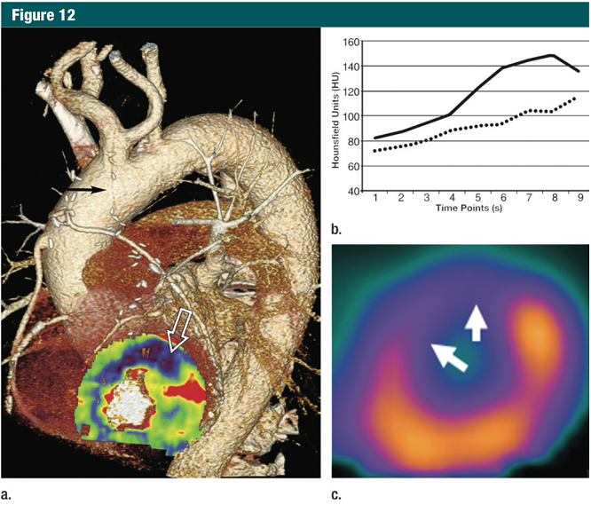 Two recent advances in CT technology are enabling more robust CT-based measurement of myocardial perfusion. Discussed previously within the context of minimizing the impact of mural calcium on the assessment of the lower extremity arterial runoff, dual-energy CT has the potential to resolve iodine concentration within the myocardium & #40;99& #41;. This method can improve the CT assessment of myocardial blood supply yielding results that are comparable to MR imaging and SPECT perfusion imaging & #40;100& #41; but augmented substantially by the associated anatomic information. Dual-energy CT has also been shown to allow for improvements in image quality and reductionin artifacts such as beam hardening that have traditionally limited CT perfusion imaging& #40;101& #41;. While dual-energy technology appears to improve myocardial assessment, when used as a part of auni-phasic acquisition during the first arterial pass through the myocardium, its capabilities for quantification are limited & #40;98& #41; .