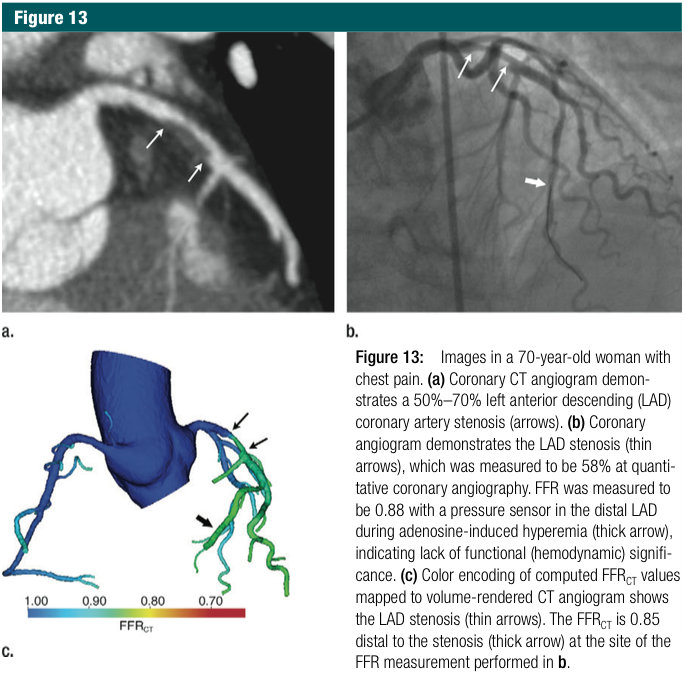 而只有一个新的进展,有越来越多的证据表明,以侵入性FFR为参考标准,高性能的FFRCT对于病变特异性缺血诊断有高的诊断准确性(图13)。最重要的,所有直至现在发布的数据显示FFRCT比单一的冠脉CT血管造影具有优势。 While only a recent development, there is increasing evidence for the high diagnostic performance of FFRct for the determination of lesion-specific ischemia, with invasive FFR as the reference standard & #40;Fig 13& #41;. Of importance, all published data until now have shown the superiority of FFRCT ascompared with coronary CT angiography alone.