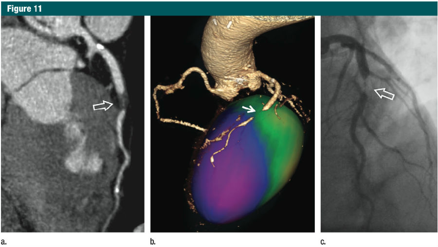图11:63岁,男性,高血压和高脂血症,呈现弥漫性胸部疼痛和气急。2年前的常规血管造影发现尚正常。 (a)心电门控CT血管造影显示的曲面重建显示左前降支(LAD)中段广泛非钙化斑块,造成严重的狭窄(箭头)。 (b)由覆盖整个心动周期的1 0组序列重建获得的局部心肌室壁运动的彩色编码图可映射冠脉病变与前壁和左室心尖部运动机能的减退的心功能的结果(紫色)(箭头)。 (C)冠脉病变(箭头)在随后的常规血管造影被证实。