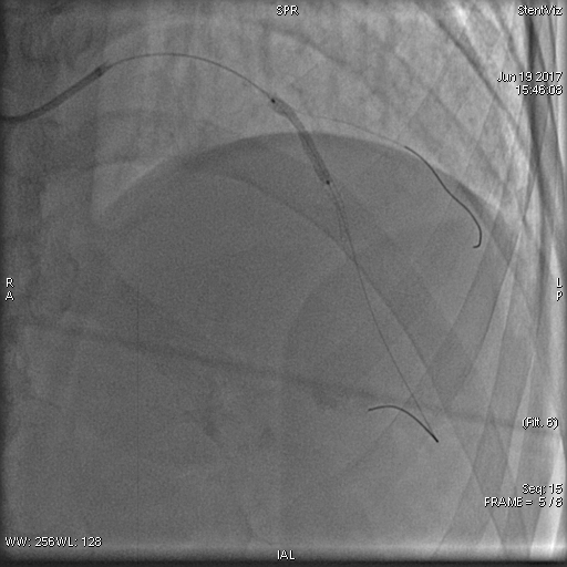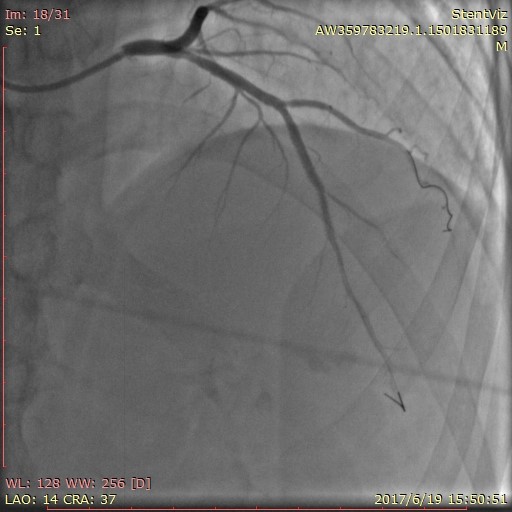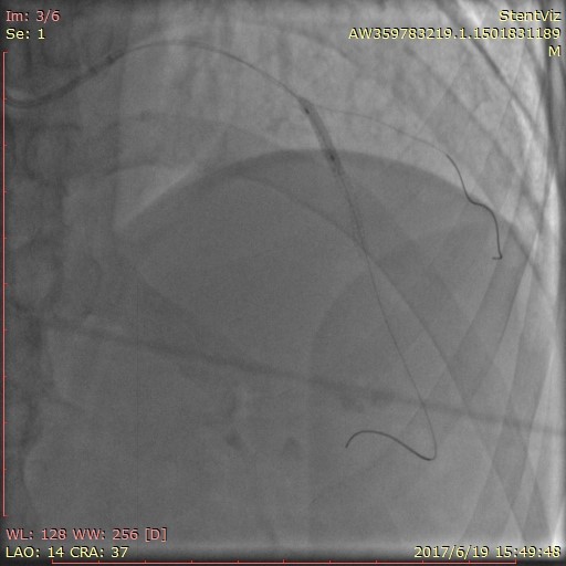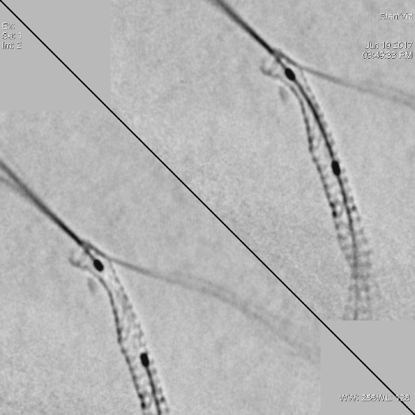 治疗方案及结果: 前降支中远段重度弥漫性狭窄,行支架植入术治疗,术后罪犯血管开通,血流通畅,达TIMI3级。 病例点评及临床价值: 前降支近段支架释放后,发现支架球囊未完全扩张,后扩后情况未明显改善,应用StentViz示:前降支近段支架与远段支架重叠良好,近段支架近端未完全扩张,有“小腰”,呈“狗骨头效应”,同时血管局部钙化斑块明显。明确情况后,继续加压扩张后,支架完全扩张,血流通畅达TIMI3级。 在本病例中,术中StentViz即刻评价了支架释放效果,精准的显示了两支架扩张、重叠和贴壁的情况,把“几乎看不见的支架”精准的呈现了支架的每一个细节,同时也显示了透视和采集不易发现的钙化病变,提高了诊断的精准度,明确了进一步的治疗方案。