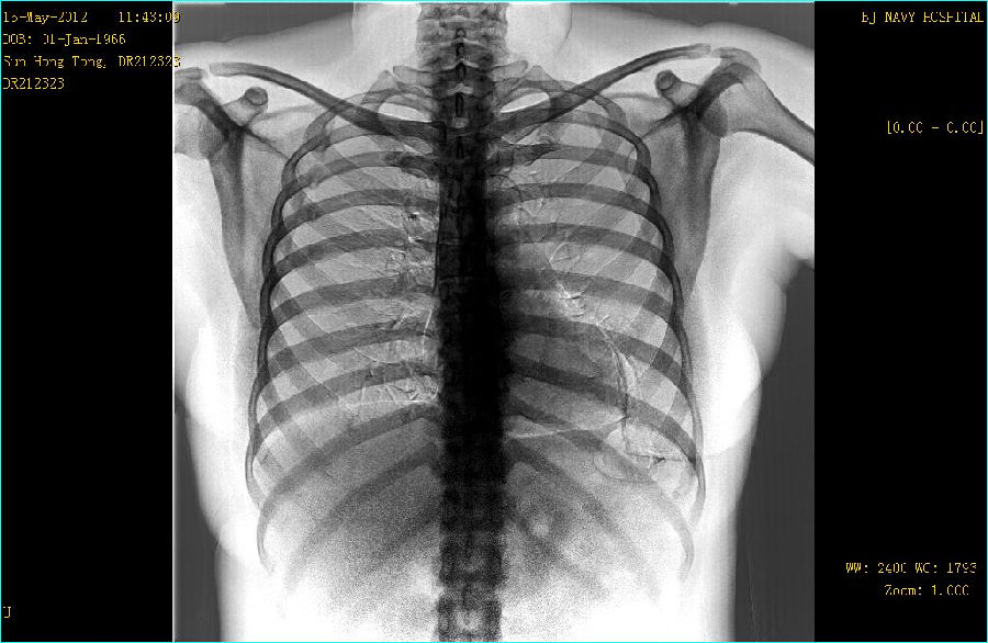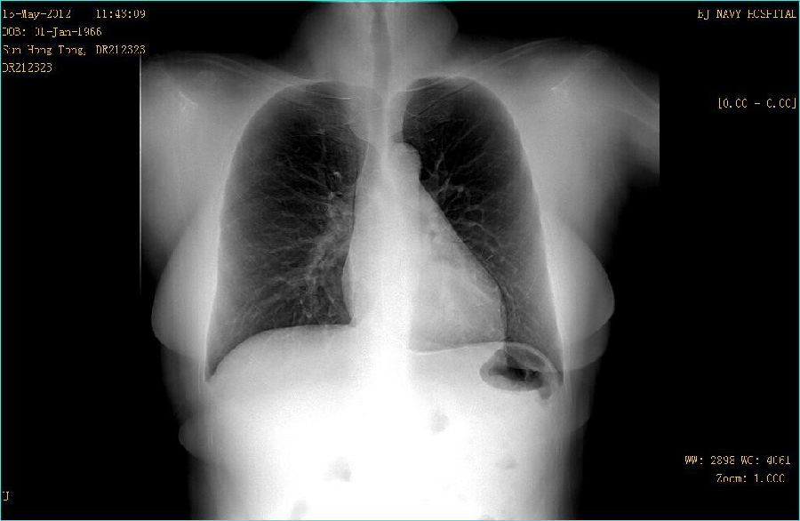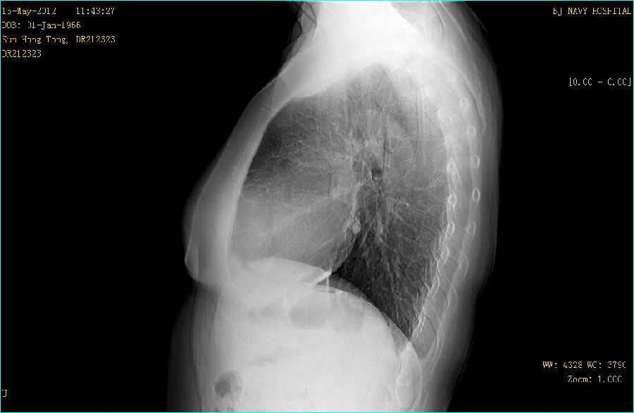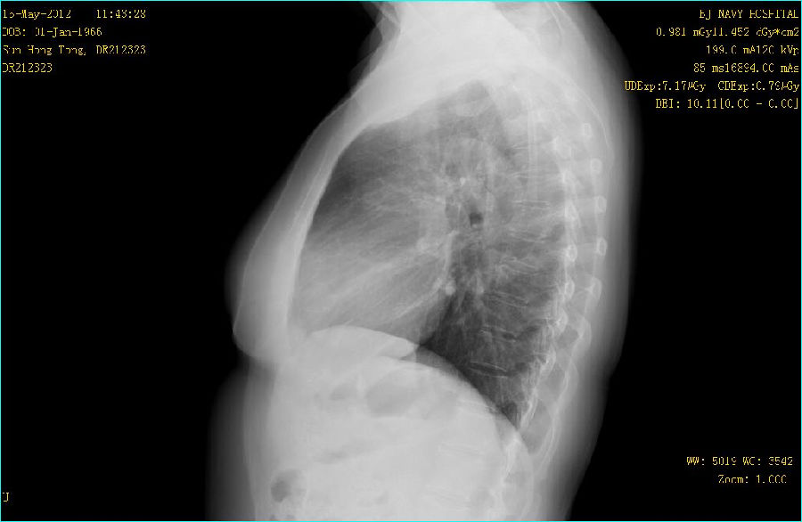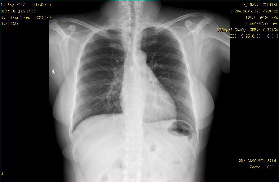 病史: M,46Y 病人主诉:常规体检 曝光参数 120KV;194mA ; 25ms ; 0.284mGy 常规胸部平片: