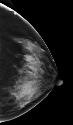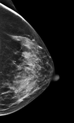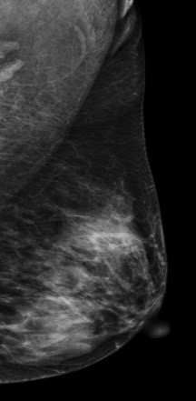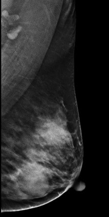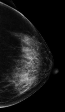 影像描述: 常规2D图像MLO位左乳腺内见多个小结节影,下象限似见一团块影,边界模糊,CC位上并没有发现异常团块影,在V-Perview图像MLO位下象限见一类圆形团块影,部分边界尚清,但CC位上并没发现明显异常团块影,DBT断层图像在MLO和CC位上左乳内下象限清晰可见类圆形致密影,其边缘光滑锐利。 影像诊断: 左侧乳腺多发良性结节,BI-RADS 3。 病例点评: 最后病理证实纤维腺瘤,类似这样病例DBT可以给我们提供更多诊断信息有助于明确病变性质。