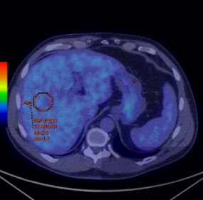 三、基于功能分子影像技术对肿瘤治疗疗效评价 从Moertel等在1976年报告基于体检方法对实体瘤治疗疗效评价,到WHO实体瘤治疗疗效评价标准(1979年),再发展到RECIST(2000)、RECIST1.1实体瘤治疗疗效评价标准。这些均是基于肿瘤解剖结构变化来评价治疗疗效。然而,许多年来已经有确切的证据表明,核医学分子影像技术可以提供独特的、生物学相关的、不可能通过解剖成像技术获得对肿瘤治疗预后的重要信息。有学者认为分子影像定量成像方法可以作为肿瘤疗效预测或治疗效果评价的生物学标志。 Yong等1999年发表采用18F-FDG PET 评价肿瘤治疗疗效的EORTC标准。该标准首次提出采用18F-FDG PET评价肿瘤治疗疗效。但是,该方法采用肿瘤病灶对18F-FDG 摄取率(standardized uptake value, SUV)作为评价肿瘤疗效指标。然而,采用体重校正的SUV存在重复性差、变异大,并且没有设置可观的参考本底的不足。另外,尽管该标准提出18F-FDG PET采集和图像处理的质量控制要求,但是缺乏严格的定量化的要求。随着PET/CT在临床广泛使用,以及EORTC在临床使用经验的积累。2009年Wahl Richard L在回顾WHO、RECIST实体瘤治疗疗效评价标准基础上,结合18F-FDG PET和PET/CT在肿瘤治疗效果预测和评价研究的大量数据后,提出实体瘤疗效PET评估标准1.0版本框架草案-PERCIST标准。PERCIST1.0标准建立在用PET评价肿瘤疗效是在连续的和不同时间点上监测肿瘤对18F-FDG摄取变化基础上。 (一) EORTC实体瘤治疗疗效评价 1. EORTC标准对肿瘤病灶基线期的定义 (1)可测量病灶与不可测量病灶的定义: 1)评价参数的确定:使用PET设备。可测量的病灶是指单个摄取18F-FDG的病灶。病灶对18F-FDG摄取测量采用病灶感兴趣区(ROI区)SUV或MRglu。选择肿瘤具有摄取最高18F-FDG摄取区域,在治疗前扫描中勾画ROI。 2)肿瘤病灶基线确定:参照肿瘤诊断的标准。 2. EORTC标准对肿瘤疗效评价 (1)靶病灶的疗效评价 CMR:肿瘤内的18F-FDG完全消失至不能与周围正常组织鉴别。 PMR:一个肿瘤化疗疗程后肿瘤18F-FDG SUV摄取至少降低15%-25%,一个疗程以上降低>25%;PMR并不要求肿瘤摄取18F-FDG范围缩小。 PMD:在基线扫描确定的肿瘤区域肿瘤18F-FDG SUV增加>25%;肿瘤18F-FDG摄取范围可见增加(最大长轴20%)或表现新的18F-FDG摄取灶。 SMD:病灶18F-FDG SUV增加<25%,或降低<15%,或未发现肿瘤18F-FDG摄取范围增加(最大长轴20%)。 (二)PERCIST1.0标准草案 1. PERCIST1.0标准草案对肿瘤病灶基线期的定义 (1)可测量病灶与不可测量病灶的定义: 1)评价参数的确定:可测量的病灶是指单个摄取18F-FDG的病灶。病灶对18F-FDG摄取测量采用病灶感兴趣区域(ROI)峰值替代传统的最大值或平均值。峰值是在1.2厘米直径球体内获得1厘米3最高值。采用SUL(Lean Body Mass)取代传统的SUV。 2)肿瘤病灶基线确定:按照肿瘤病灶的SUL峰值应当是1.5´肝脏平均SUL+2倍标准差。如果肝脏有疾病,那么肿瘤病灶最小有代谢可测量肿瘤的活性可以看作2.0´血池活性+2倍纵隔标准差。 3)肝脏和血池本底选择:在肝脏右下叶勾画3厘米ROI作为本底区(不能包含大血管组织)(见图2)。假如肝脏异常,原发肿瘤摄取应当>2.0 ´SUL (在降主动脉)。
