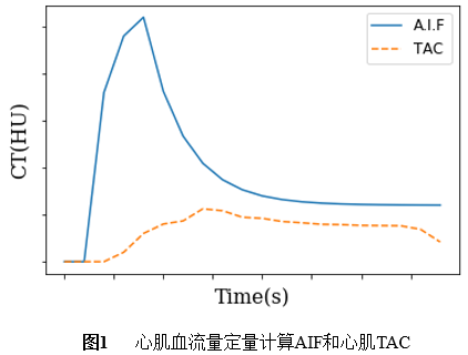 (2)心肌血流量测量模型:心肌局部血流量(regional myocardial blood flow, rMBF)测量,首先需要获取动脉输入函数(input arterial function, AIF)和局部心肌组织的对比剂浓度变化曲线。以升主动脉作为动脉输入函数(AIF),整个心肌作为感兴趣组织(region of interest, ROI),以单个像素(pixel)为单位,以获得心肌局部血流量(rMBF)。图1是降主动脉AIF和心肌组织时间衰减曲线(time attenuation curve, TAC)示意图。获得AIF、ROI心肌组织的时间衰减曲线(TAC)就可以采用心肌血流模型计算心肌局部血流量。