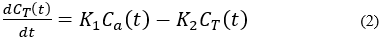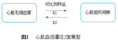 2)2 -Comp模型:2室模型是假设对比剂在毛细血管与心肌组织之间服从2室分布规律。对比剂不但可以通过毛细血管进入心肌组织间隙,而且从组织间隙还可以返回到毛细血管(见图2)。对比剂在毛细血管和组织间隙中处于动态过程[7,8]。假如设心肌组织TAC为CT(t),动脉AIF为Ca(t),从毛细血管到组织间隙和从组织间隙到毛细血管对比剂扩散(转运)常数分别为K1、K2。那么心肌组织血流量可以用(2)式公式表示。通过(2)就可以计算出心肌局部血流量。2室模型与最大斜率计算心肌血流量模型比较,它考虑到对比剂在心肌组织间隙可能返回毛细血管的因素。2室模型能够获得更多的心肌血流灌注、心肌组织毛细血管通透性的血流动力学参数。但是,与最大斜率方法相比较,2室模型计算比较复杂。