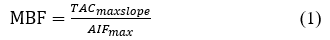 1) Slope模型:斜率模型是假设对比剂到达心肌组织速率与血流速度正相关。心肌血流量(MBF)(ml/min/g)与心肌组织TAC和动脉输入函数AIF最大值关系为公式(1)。最大斜率方法简单、方便,但是对对比剂注射速度、方式要求严格,而且易受多种因素影响[6]。在实际使用中通常采用心肌TAC上升段平均斜率来替代最大斜率。
