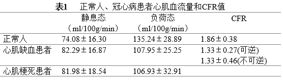 2. 心肌血流量在冠心病诊断、疗效评估应用 心肌血流量测量在冠心病早期诊断、疗效评估具有重要的价值。核医学影像技术在心肌血流量灌注研究中已经积累丰富的临床经验,并且被作为无创心肌血流灌注成像临床“参考标准”。但是核医学成像技术受到放射性药物限制,影响成像时间和朝着临床普及化方向的发展。采用CT低剂量成像技术,在获得CCTA图像同时获得心肌局部MBF已经成为临床研究的热点。Ho 等学者报道,采用常规体部血流灌注软件计算心肌局部血流量方法,对35例受检者进行研究[10],获得心肌血流量和CFR结果见表1。可以看出负荷试验和CFR对于心肌缺血的诊断比起单独的静息态MBF具有更重要的临床价值。