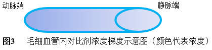 3) Distr模型:毛细血管的长度远远大于其直径,这样对比剂在毛细血管内就形成了浓度梯度差(见图3)[9]。这种现象在放射性示踪剂基础的首次通过“弹丸”血流量计算中队结果影响很小,但是对于CT对比剂,由于注射体积大,容易在毛细血管中形成大的浓度梯度,这就需要对其进行校正。通过Distr 模型校正后提高心肌血流量结果的准确度。