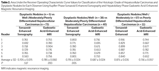 在被检测的各组病灶的ROC曲线下面积如下表所示。其中Sonazoid超声造影检查组的AUC(ROC曲线下面积)值(0.871 ± 0.035)大于钆酸二钠造影增强MRI检查的AUC(ROC曲线下面积)值(0.716 ± 0.057)(P= .005).