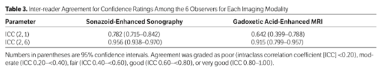 ICC(2,1)的情况下,Sonazoid超声造影检查组的一致性系数为0.782,而钆酸二钠造影增强MRI检查的一致性系数为0.642. 在ICC(2,6)的情况下,Sonazoid超声造影检查组的一致性系数为0.956,而钆酸二钠造影增强MRI检查的一致性系数为0.915.