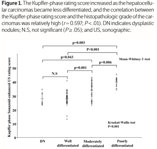 本研究探究Sonazoid超声造影检查的影像学特征和钆酸二钠造影增强MRI的影像学特征与肝脏局部病灶的组织学分化情况之间的关系。研究发现,上述两种方式均与组织学分化程度关系密切。若病灶显示出典型的“快出”征象“则是低分化或中度分化HCC的可能性大,反之,则更可能为分化良好的HCC。