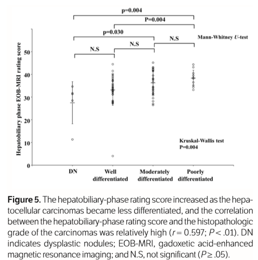 HCC的分化程度越低,肝胆管期的分数越高,且二者相关性较高(r=0.400,P<0.1)。分化不良的HCC的Kupffer相分数相比于分化良好的HCC (P=0.004) 和发育不良性结节(P=0.004)都更高。同时,中度分化HCC病灶Kupffer相分数相比育不良性结节(P=0.030)也更高。但在分化不良的HCC和中度分化的HCC,中度分化的HCC和分化良好的HCC,或分化良好的HCC和发育不良性结节中肝胆管期的分数却无统计学差异。