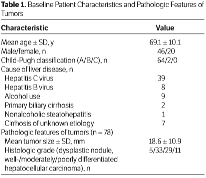 本研究选取66名曾进行过钆酸二钠造影增强MRI检查和Sonazoid超声造影检查的患者的资料进行回顾性研究。所有患者的病灶都是常规超声检查发现的,并最终进行了病理诊断。其中有73个肝细胞性肝癌结节,5个发育不良结节。其中59名患者仅有1个肝细胞性肝癌结节,11名患者有2个肝细胞性肝癌结节,4名患者仅有1个发育不良性结节,1名患者有2个发育不良性结节。并且根据病理标本进行组织学分级。