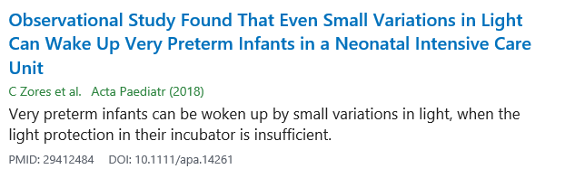 这项前瞻性观察性研究评估了极早产婴儿对自然光变化的行为反应。 方法:在27个极早产婴儿的暖箱中测量了自然光的变化,这些婴儿平均胎龄为28周(26-31周),超过生后10小时。他们于2008年4月至2009年7月期间被送往法国史特拉斯堡大学医院的新生儿护理室。两名独立评估者使用录像检查了婴儿行为状态的变化。记录有光线变化和控制期间光线无变化时的觉醒百分比。 结果:分析了光变化后的275个周期和275个控制周期。光照变化后的总觉醒百分比高于对照期(16.3%对11%,p = 0.03)。光线的保护程度会影响唤醒的百分比。在温和的光线保护下,光线变化后的觉醒次数比对照组要多(25.6%对6.7%,p = 0.01)。在高光保护中未发现此差异。 结论:当保育箱中的光线防护不足时,非常小的早产儿可以通过光线的微小变化被唤醒。