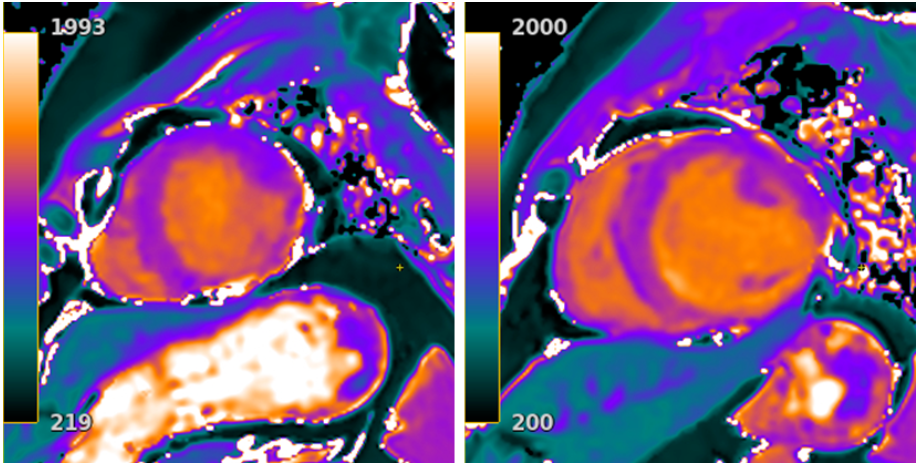 电影序列提示壁薄处,心肌厚度明显变薄,且其中混杂低信号。什么原因导致,出血成分,脂肪沉积,纤维成分?心室内混杂血流信号,这符合患者心衰症状;心衰患者,心室内的血液流动性变差,类似于附壁的慢血流,慢血流相当于静止的水,所以T2fs呈高信号。2.3 心肌T1 MAPPING