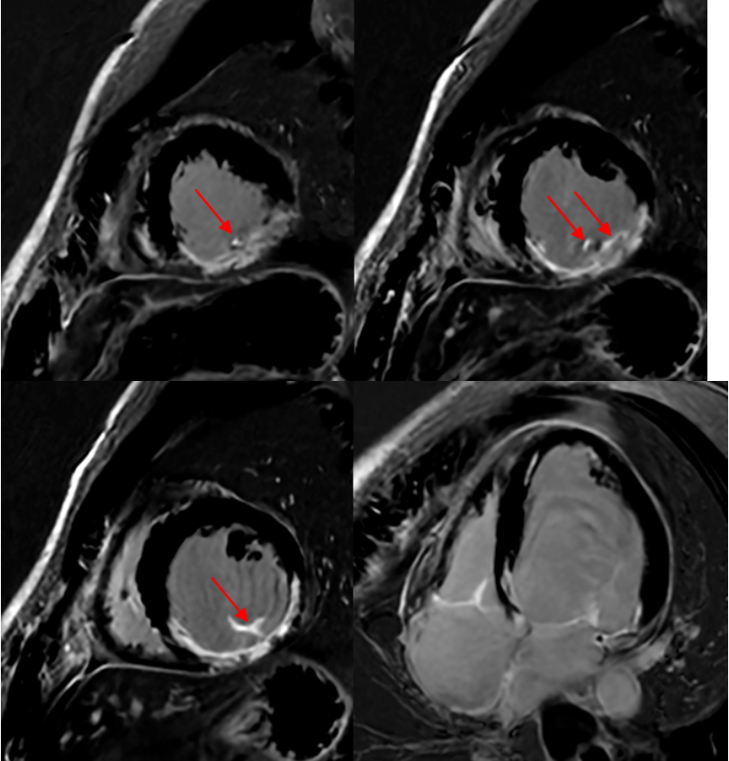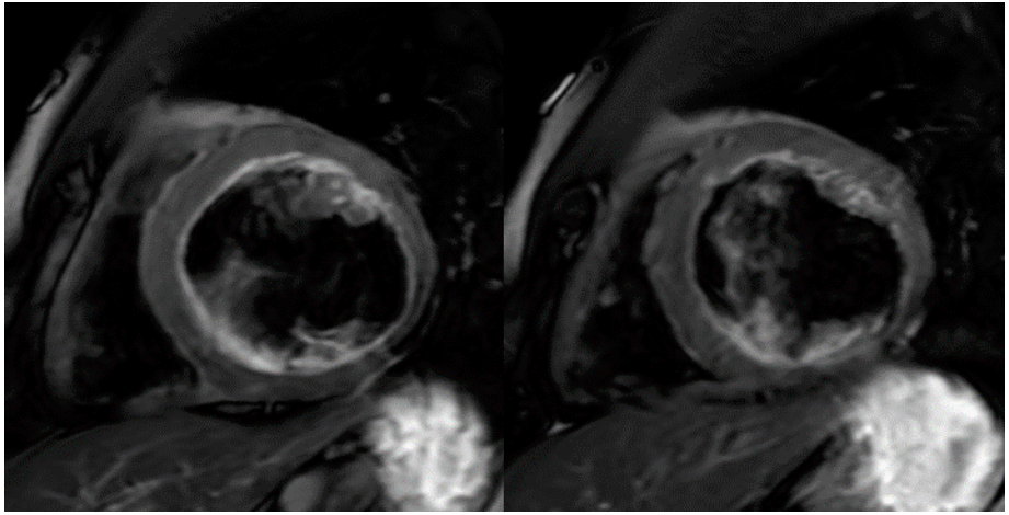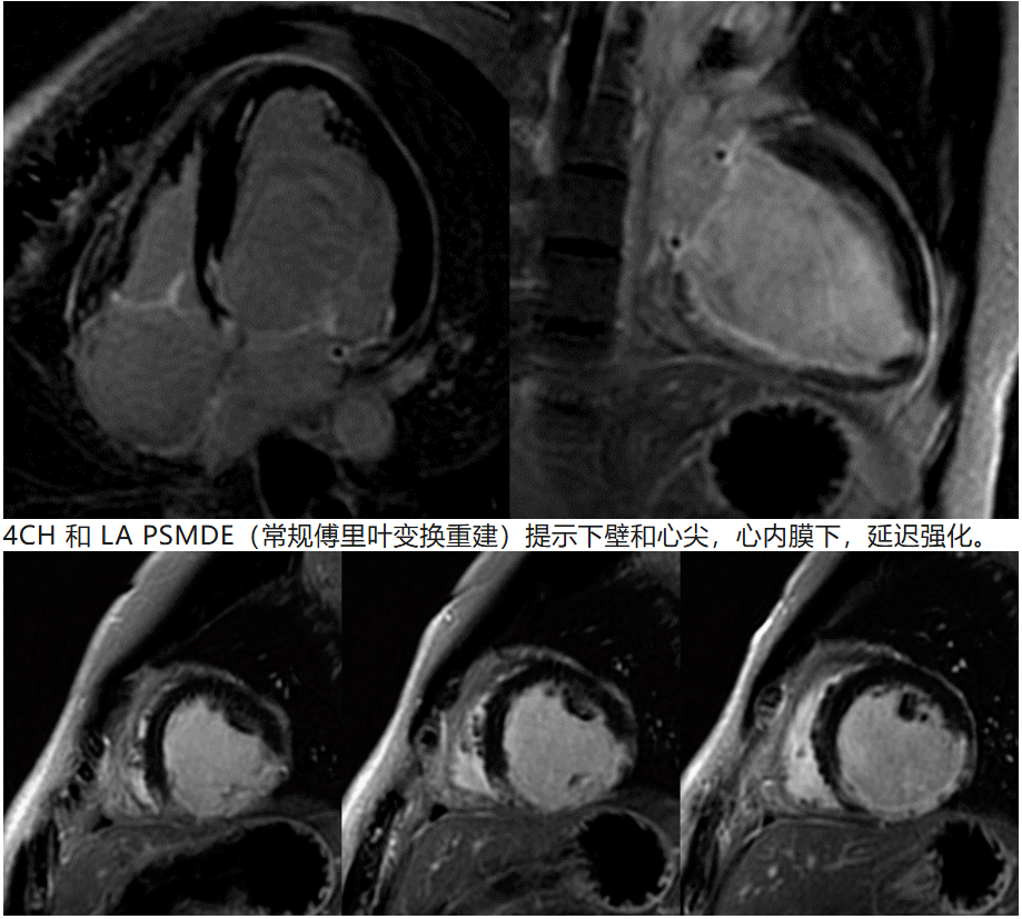 SA PSMDE(常规傅里叶变换重建)进一步提示下间隔壁,下壁,下侧壁延迟强化,范围超过心肌厚度的50%,提示患者透壁性心肌梗死。这时候,有必要结合病史,理性反推求医过程: 主诉:心脏术后1年余,活动后胸闷1年。 现病史:缘于入院前1年余因“二尖瓣关闭不全”于外院行“二尖瓣成形”,术顺,术后规律服药,1年前无明显诱因出现胸闷、气促,爬3层楼即出现症状,休息后稍缓解,无胸痛、心悸,无端坐呼吸、咳粉红色泡沫样痰、无夜间阵发性呼吸困难,无腹胀、眼黄、尿黄、肢体浮肿,无畏冷、发热、无黑膘、晕厥,无食欲减退、消瘦,就诊外院完善相关检查后诊断“心力衰竭”,予诺欣妥、信他乐克、螺内酯、达格列净等药物治疗,上述症状仍反复发作,今为进一步治疗就诊我院查心脏彩超:二尖瓣成形术后;二尖瓣轻度返流,左室收缩功能重度减退,EF:28.9%,为进一步诊治,门诊拟“心力衰竭”收治入院。自发病以来,精神、食欲、睡眠尚可,二便正常, 体重无明显改变。 既往史:平素体质一般,否认“高血压、糖尿病、冠心病”等慢性病史,否认肝炎、结核、菌痢、伤寒等传染病史,否认其他手术、输血、外伤史,否认过敏史,预防接种按时完成。 个人史:生于原籍,否认长期外地居住史,否认疫区居留史,否认特殊化学品及放射线接触 史。否认吸烟、饮酒史。 婚育史:已婚未育,配偶体健。 家族史:否认家族中类似疾病史。否认家族中“血友病”等遗传性疾病史及"糖尿病、恶性肿瘤”等遗传倾向性疾病史。否认家族中´病毒性肝炎、结核病、伤寒、痢疾”等传染病史 (1)一年前,心衰症状出现:无明显诱因,爬三层楼出现胸闷气促; 意味着一年前,可能的诊断是二尖瓣关闭不全导致心衰。所以治疗手段是二尖瓣成形术,术后规律服药。 面临的困境是目前活动后胸闷。B超提示LVEF = 28.9%。本次MR检查提示LVEF = 43%。本次MR检查提示患者下侧壁、下壁和下间隔壁透壁性心肌梗死,黑血DIR FSE提示心肌无水肿,所以这大概率是一个陈旧性的心肌梗死。2.5 PSMDE基于deep learning recon的重建