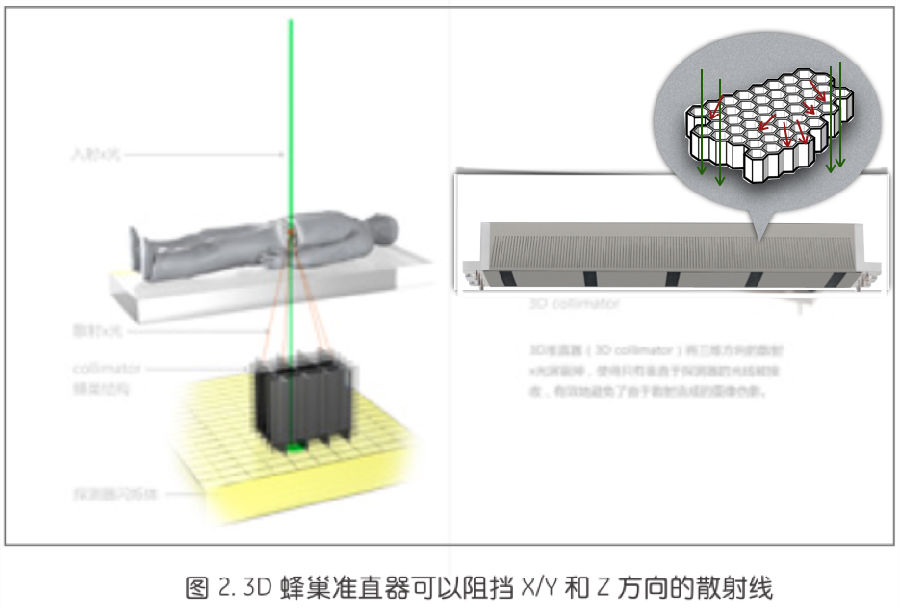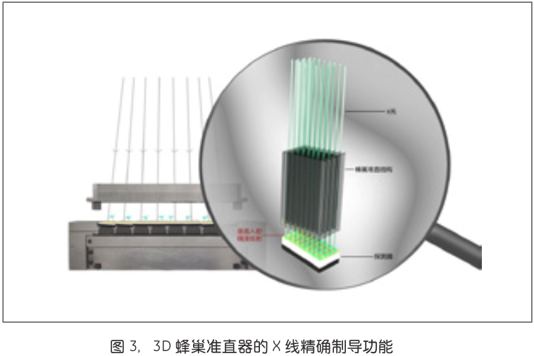 64排CT的 X 线锥形束夹角不超过4.2°,而16厘米探测器的夹角约为其4倍(图1),散射线效应大大增加,采用常规的“一维后准直器”与相对简单的散射校正算法,无法解决宽体CT的散射线效应问题。为了解决这一问题,GE专门为Revolution CT研发了一款 “3D后准直器”——3D蜂巢准直器。相对于“一维后准直器”,3D蜂巢准直器在X/Y轴方向上加了一组滤线栅,用来阻挡Z轴方向的散射线(图2)。除此之外,3D蜂巢准直器还具备X线三维精确制导功能,保证X线能够垂直进入每个探测器单元(图3)。在与“一维后准直器”比较时,3D蜂巢准直器能够实现在等中心点处的散射率SPR降低50%以上,实现更好的图像质量。