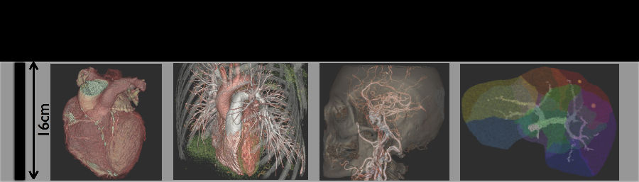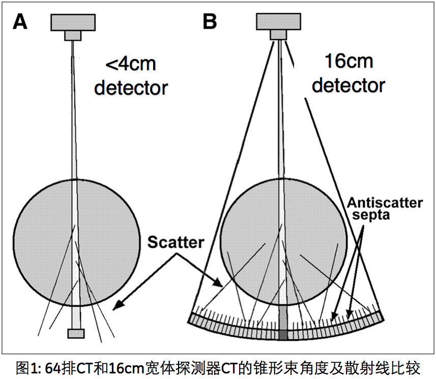 然而从物理学角度,16厘米的宽体探测器将对CT成像的图像质量带来一系列严峻的挑战: 1)散射线效应增加; 2)X的足跟效应及Z轴CT值的不一致性; 3)锥形束伪影。