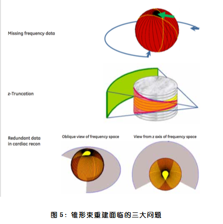 3. 锥形束伪影 为了根本解决困扰宽体CT的锥形束问题,Revolution CT从硬件和重建两方面入手。首先16厘米探测器采用了等焦点设计(focus aligned),使每一个探测器单元都和入射的X线垂直,这从硬件设计的角度在最大程度地解决锥形束现象。从重建算法角度看,锥形束重建面临着一系列的技术挑战,这些技术挑战包括(图5): 1)Z轴信号盲区; 2)频域空间信号缺失; 3)心脏扫描重叠信号不当处理。