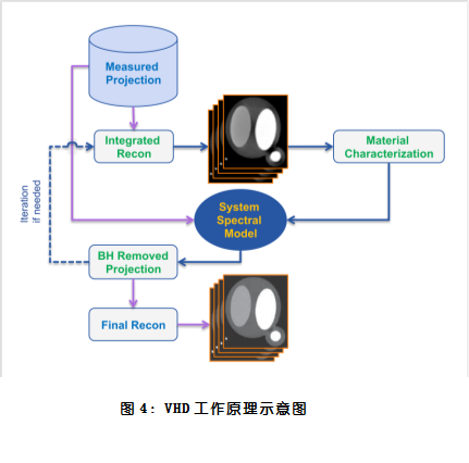 2. 足跟效应 足跟效应(Heel Effect)是指远离球管阴极端出射的X线,相较于近球管阴极端出射的X线的逃逸距离长,X线硬化更明显,平均能量也更高。足跟效应在64排CT上不显著,但随着16厘米宽体探测器的X线锥角增加,足跟效应显著增加,并引起X线频谱发生较大的变化,导致整个Z轴覆盖范围的CT值发生显著偏移。专为Revolution CT开发的高清容积重建(VHD:Volume High Definition)技术(图4),建立在X射线基本属性的基础上,并借鉴了CT能谱成像的物理和临床经验,通过使用一个源于复杂校准和物理建模的X线能谱模型去除X射线的硬化,并通过迭代技术进行反复校正,直到获得最终的高清CT 图像。