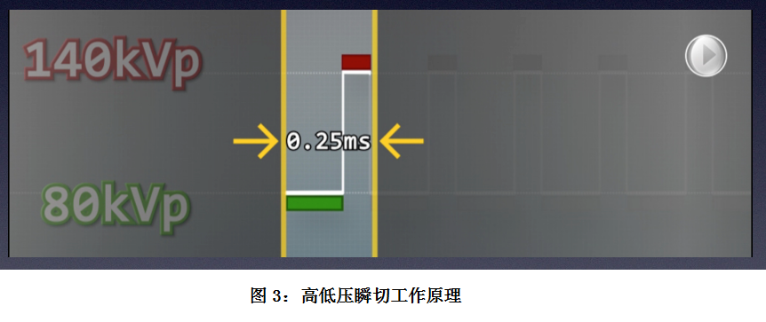 1.能谱成像的硬件平台实现能谱CT成像要求CT在数据采集过程中获得在投影数据空间可匹配的高低两组能量数据,意味着极速单源瞬时kVp切换技术要能够实现必须满足以下条件: ①三同的高、低能量数据采集,避免解剖结构的空间位移; ②稳定的高、低kVp电压的输出,保证信号的一致性; ③高、低能量信号之间要具有很好的区分度,不存在信号混淆; ④高、低能量的信息量要满足CT重建的需求。