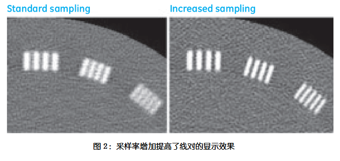 高集成化数据采集系统(图1),将传统的数据采集系统高度集成到一个芯片上,降低了电子噪声,实现了12000Hz(Views per second)的超高采样频率2,相当于机架每旋转0.144度就进行一次采样。超高采样频率可以为图像重建提供更多的数据。对同一物体而言,采样的数据越多,越能够精确地确定其形状、空间位置和细节3(图2)。
