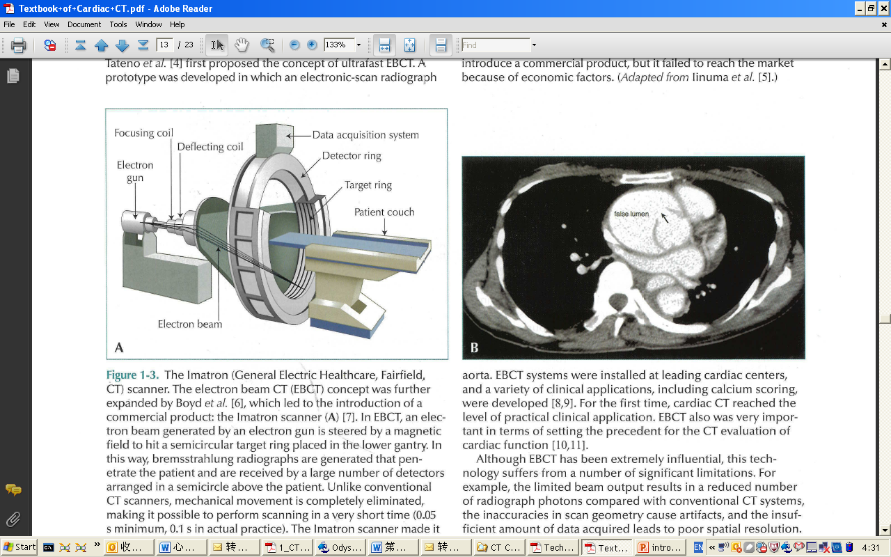 图:电子波束CT构成(A)以及临床心脏扫描图像(B) 图A就是Imatron(GE医疗)生产的电子束CT扫描机。电子波束CT(EBCT)的概念被Boyd等人进一步扩充,并由此产生了商用产品Imatron扫描机。在EBCT中,偏转磁场控制电子枪发射出电子波束,轰击放置在机架低端的半圆形阳极靶。通过这种方式产生的韧致辐射穿过病人,被放置在病人上方的半圆弧形探测器阵列接收。跟传统的CT不同的是,EBCT完全不需要机械运动,这使得在很短的时间内(最少0.05秒,通常实践中0.1秒)完成扫描成为可能。Imatron扫描机第一次实现了忽略心脏运动的影响得到跨心动扇区的心脏和大血管的图像。 图B是EBCT系统上得到的急性主动脉夹层动脉瘤Stanford A/DeBakey I 型图像。在出现症状8小时后用0.1秒的扫描,从这幅图像上我们能够清楚的看到升主动脉内膜的撕裂口(箭头所示)。EBCT 曾经安装在主流的心血管研究中心,与之而来的还有多种多样的临床应用,例如钙化积分。EBCT使CT心脏影像第一次达到了临床应用的水准,对于CT心功能评价也具有非常重要的价值。 尽管EBCT有极大的影响,但这项技术也受到诸多的限制。例如,输出波束的限制导致放射光子数比常规CT有所降低;数据获取不充分导致差的空间分辨率等。迄今为止为了达到更好的图像质量,EBCT引入了某些新技术,然而,多排探测器CT的优势以及迅速发展逐渐减弱了人们对EBCT的关注度。 多排螺旋CT的发展,使冠脉CT不断应用于临床一线。多排螺旋CT采用阵列探测器和多通道数据采集系统,机架旋转一圈能同时获得多个层面的断层图像,相对于单排螺旋CT而言大大提高了扫描速度和空间分辨率。最初的多层螺旋CT,X线管旋转一周完成的容积数据采集可重建出2或4层图像,之后在短短的几年内,又相继推出了8层、16层、32或40层发展到今天的64层,实现一次采集可获得64层图像。现在的多排螺旋CT已经能够实现心脏成像和准确地显示冠状动脉树。