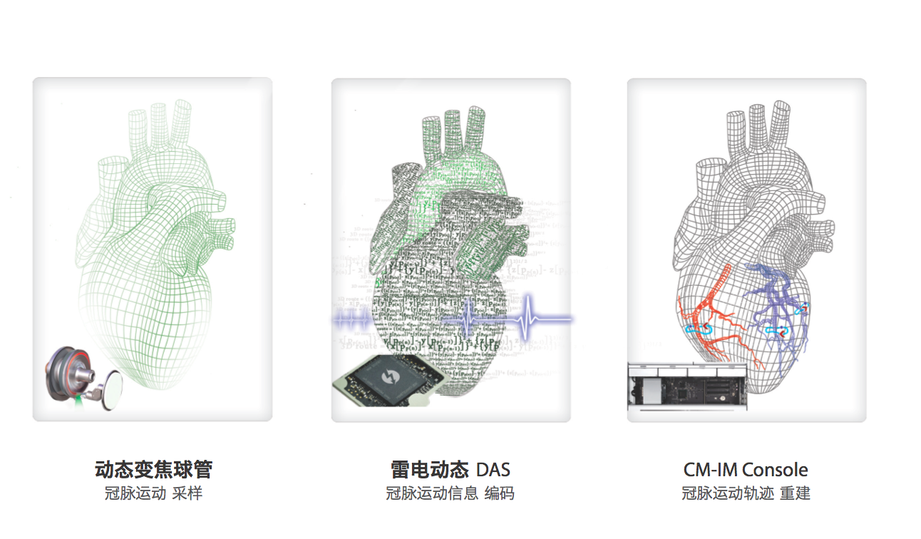 2012年,一种全新的心脏扫描方法诞生:冠脉运动追踪成像法(SSF:SnapShot Freeze)。SSF是一个囊括了采样、编码、重建的心脏硬件平台:通过动态变焦球管进行高清采样,得到心脏运动过程中的一系列图像,通过雷电DAS对相邻期相的图像运动信息进行迭代傅立叶变换,在频域对冠脉运动(路径和速度)进行分析和建模(Motion Characterization),从而对运动模糊进行矫正,消除残余的运动伪影,有效地压缩重建时间窗,得到清晰的冠脉解剖图像。SSF可以对冠脉的多个节段进行运动分析,从而对每个冠脉体素的运动进行追踪和矫正。SSF可以追踪冠脉的运动过程,去除冠脉运动伪影和断层现象,在低剂量的前提下,达到自然心率的高清成像,大幅度提高了冠脉CT扫描的适应范围。