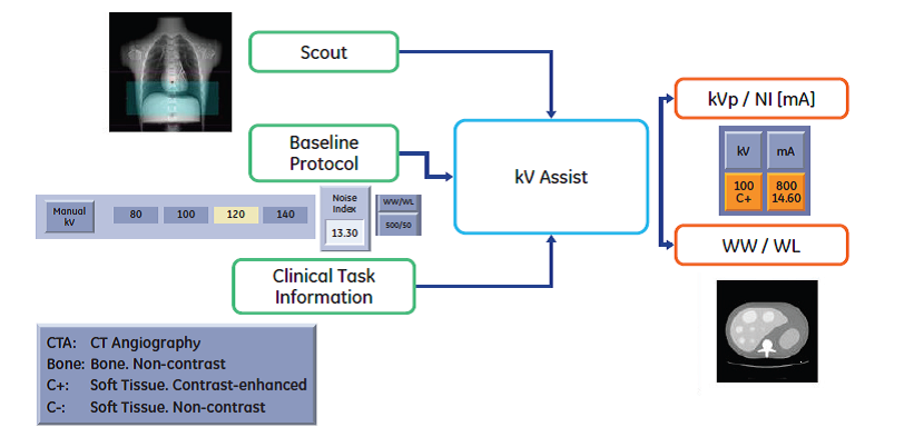 GE公司最新开发的人工智能主机(Smart Console)包含平扫模式、心脏模式和能谱模式(KV Assist、Snap Shot Assist、 GSI Assist)。以KV Assist为例,智能主机通过Scout 扫描中穿透患者身体的光子数量计算出每个患者的eBMI,从而推荐最适合当前患者的kVp扫描值和窗宽窗位等。虽然患者体型和临床检查类型存在差异,但通过kV Assist技术,可实现在保证图像质量的前提下,减低辐射剂量,同时明显加快扫描流程。人工智能主机(Smart Console)的出现,把个性化扫描和简化流程联系起来,让个性化CT扫描成为临床常规!