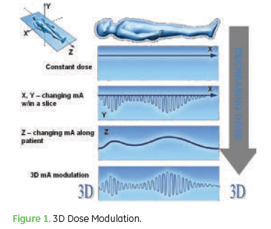 3. 剂量的控制(低剂量技术) 放射检查中应该遵循“合理使用低剂量(as low as reasonably achievable,ALARA)”原则。即以最低剂量来获取满足临床需要的诊断性影像的原则。 目前,控制CT扫描的剂量一个方法是使用基于投影数据空间的迭代重建技术,比如ASiR和Veo等技术。另一个方法是智能个性化扫描技术,例如自动管电流调节技术(Automatic Tube Current Modulation)和人工智能主机(Smart Console)。 自动管电流调节技术(Automatic Tube Current Modulation)能够帮助我们在预先设定噪声参数(Noise Index)的情况下最佳化球管的电流输出。