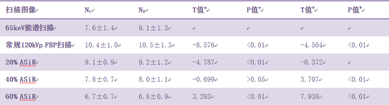 注:FBP:滤波反投影;ASIR:自适应统计迭代重建;N1:肝实质的测量噪声;N2:膀胱区的测量噪声;a:各常规120 kVp扫描图像分别与 65 keV单能量图像上肝实质噪声的比较;b:各常规120 kVp扫描图像分别与65 keY单能量图像上膀胱实质噪声的比较。