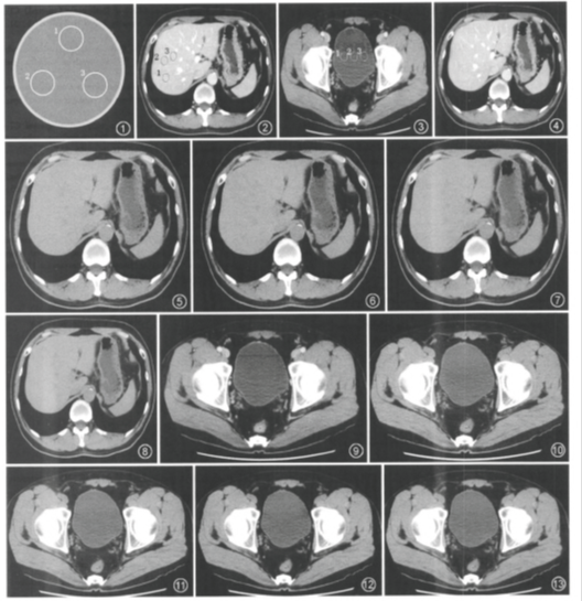 图1 质量评价标准体模水模部分CT值测量示意图,l、2、3为3个ROI。图2,3为能谱扫描65 keV单能量CT横断面图像,分别为肝脏(图2)和膀胱区(图3)实质测量示意图,1、2、3为3个ROI。图4—8为肝脏cT横断面图像。图4为能谱增强扫描65 keV单能量图像,图5为常规扫描滤波反投影(FBP)重建图像,图6~8分别为20%、40%和60%自适应统计迭代重建(ASIR)常规扫描图像,图5—8的图像噪声逐渐降低,图4的图像噪声与图7基本相当。图9—13为膀胱CT横断面图像。图9为能谱增强扫描65 keV单能量图像,图lO为常规扫描FBP重建图像,图11—13分别为20%、40%和60%ASIR常规扫描图像,从图10~13图像噪声逐渐降低,图9的图像噪声与图11基本相当。
