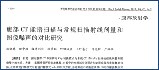 腹部CT能谱扫描与常规扫描射线剂量和图像噪声的对比研究 (中华放射学杂志,2013,Vol47,No.2,P:116-120) 上海瑞金医院 林晓珠 【Summary】腹部是能谱CT目前应用最为广泛的部位,如何在尽可能低的射线剂量条件下获得可供临床诊断的图像质量一直是相关领域学者致力研究的课题。本研究中,通过体模实验明确了CT常规扫描与能谱扫描模式的mAs之间的关系,建立了两者的回归方程,并根据目前可选的能谱成像扫描参数计算出了相对应的常规扫描的mAs,实现了能谱扫描的个性化。临床研究结果显示,对于相同范围的全腹部CT,常规扫描模式与能谱扫描模式在射线剂量方面差异无统计学意义。本研究也是宝石的最新的GSI Assist技术开发的理论基础之一。GSI assist工具根据病人的定位相(Scout View)获得病人体型大小(eBMI),从而可以自动选择与常规非能谱扫描相似辐射剂量(CTDIvol)的GSI协议,同时实现了一键式智能选取病人个性化GSI协议的临床要求。最新的能谱成像技术已经可以与ASiR技术结合使用(Jpn J Radiol (2014) 32: 217-223),允许操作者根据需要选择不同水平的ASiR重建单能量等能谱图像,这也将为进一步提高CT能谱成像的图像质量和降低剂量提供可能。
