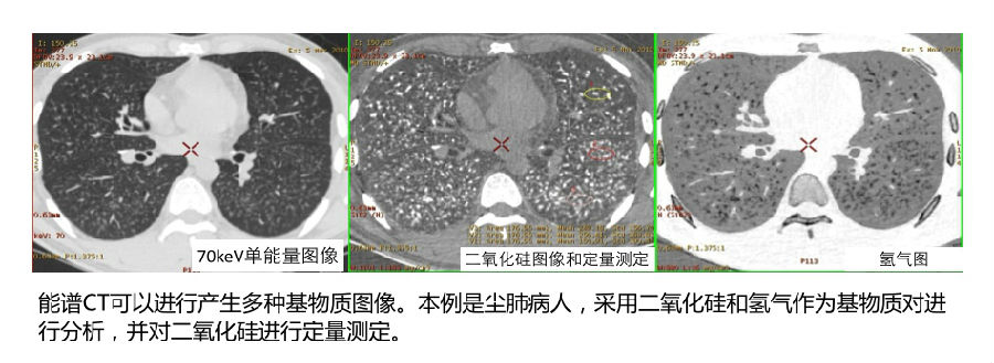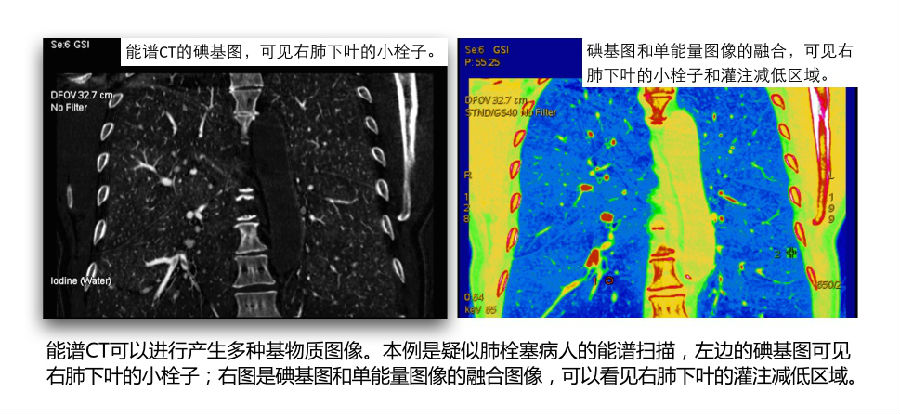 通过计算每个像素点中特定物质的含量,能谱CT可以产生诸如碘基图、尿酸图、虚拟平扫图等基物质图像。 This computational process which determines the amount of a substance within each image voxel is used to produce clinically relevant presentations of the data such as iodine images or overlays, uric acid maps, or a virtual unenhanced image, sometimes referred to as virtual noncontrast image.