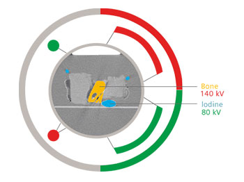 能谱CT的基物质图像是通过“基物质解析“过程实现。这种过程可以分析水/碘、钙/碘、脂肪/碘等。因为这种方法的灵活性,能谱CT可以定量分析 NIST(美国国家技术与标准管理局)物质数据库中具备的各种物质(例如:钆、金、铁、血液、粘液等)。 With rsDECT, this process uses material decomposition basis pairs of water(–iodine) and iodine(–water) to create the virtual unenhanced and iodine material images. On the rsDECT workstation, the same material decomposition basis pair process can evaluate other substances, such as calcium(–iodine) and iodine(–calcium), or fat(–iodine) and iodine(–fat); any material for which a NIST (National Institute of Standards and Technology) attenuation curve is available (gadolinium, gold, iron, blood, mucin, etc) can be installed into the system and then the material can be rapidly evaluated quantitatively on the images.