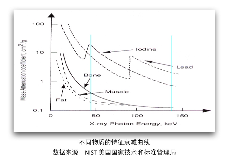 二、能谱CT(单源高低压瞬时切换技术)可以产生基物质图像。 rsDECT can generate material density images for diagnosis. 能谱CT基物质图像基于基本的物理原理:特定元素(例如钙、碘、金、钆)或者特定物质(例如脂肪、血液、粘液等)会针对X线的不同能量产生不同的线性衰减系数。利用这个特性,我们可以通过能谱CT来区分这些物质。 One type of image is the material density image, sometimes referred to as material-specific image. Because linear attenuation coefficients obtained at different X-ray energies are unique for a given element, such as calcium, iodine, gold, gadolinium, or a substance such as fat, blood, mucin, etc, the change in attenuation between the two energy spectra used for DECT can be used to discrimi- nate the materials.